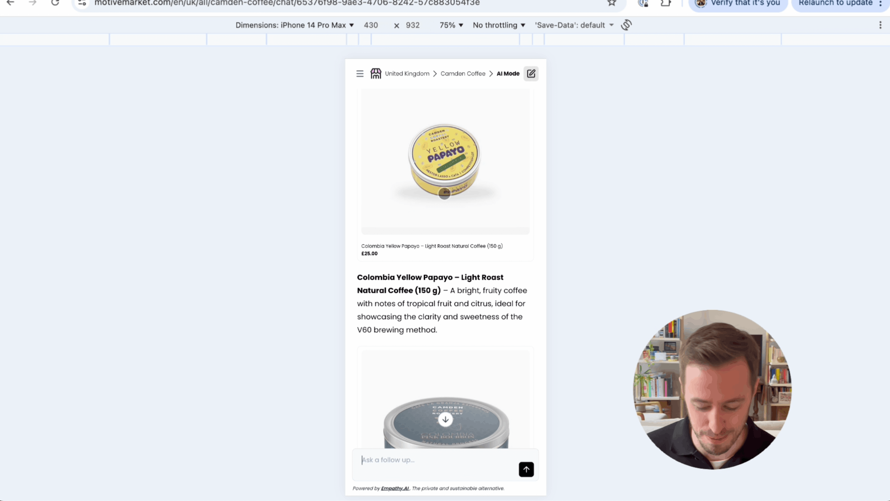 The search bar, reimagined. Let customers shop the way they think. Chat, clarify, compare, and decide. Remembers context across questions with chat history. Built to be private, sustainable, and independent from big tech.