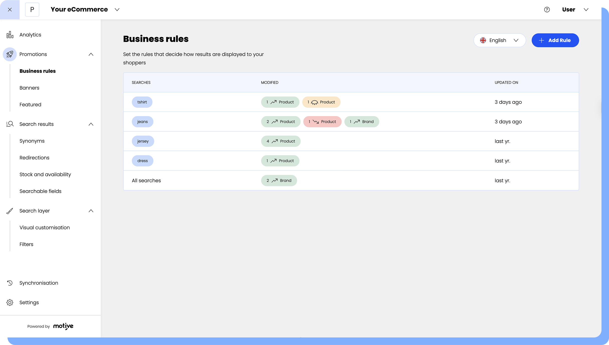 Your complete toolkit for high‑converting search. Promote products with banners and rules, tune relevance with synonyms and redirects, and customise the search experience to fit your brand with analytics that show what shoppers search, click, and buy, so you can optimise with confidence.